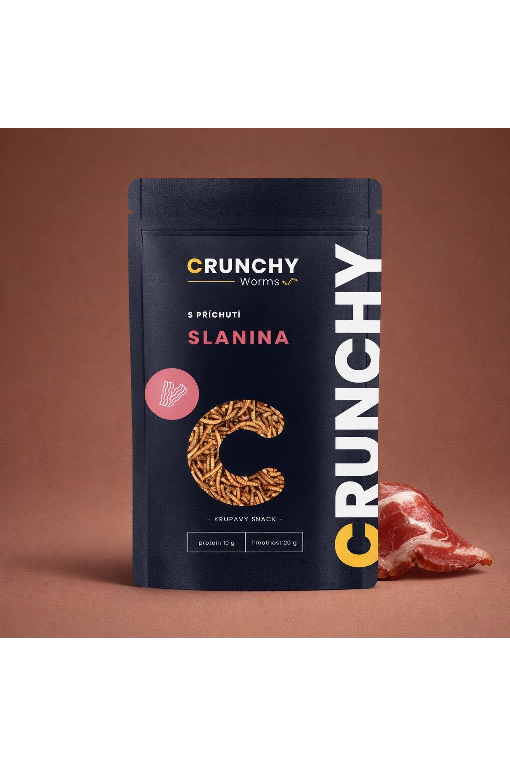 Slaninová varianta sází na kouřovou vůni a příjemně „grilový“ dojem, který vás chytne hned po otevření. Chuť je výrazná, slaná a lehce masová, s kouřovým dozvukem, který vybízí k další hrsti. Pražený charakter dodává snacku plnost a dělá z něj skvělou alternativu k chipsům nebo oříškům. Textura je suchá a krásně křupavá, takže se červíci výborně zobou i jen tak z misky. Skvěle se hodí na párty stůl, k pivu nebo jako netradiční pohoštění pro hosty. Perfektně fungují jako slaný doprovod k pivu a dalším „grilovacím“ chutím.
